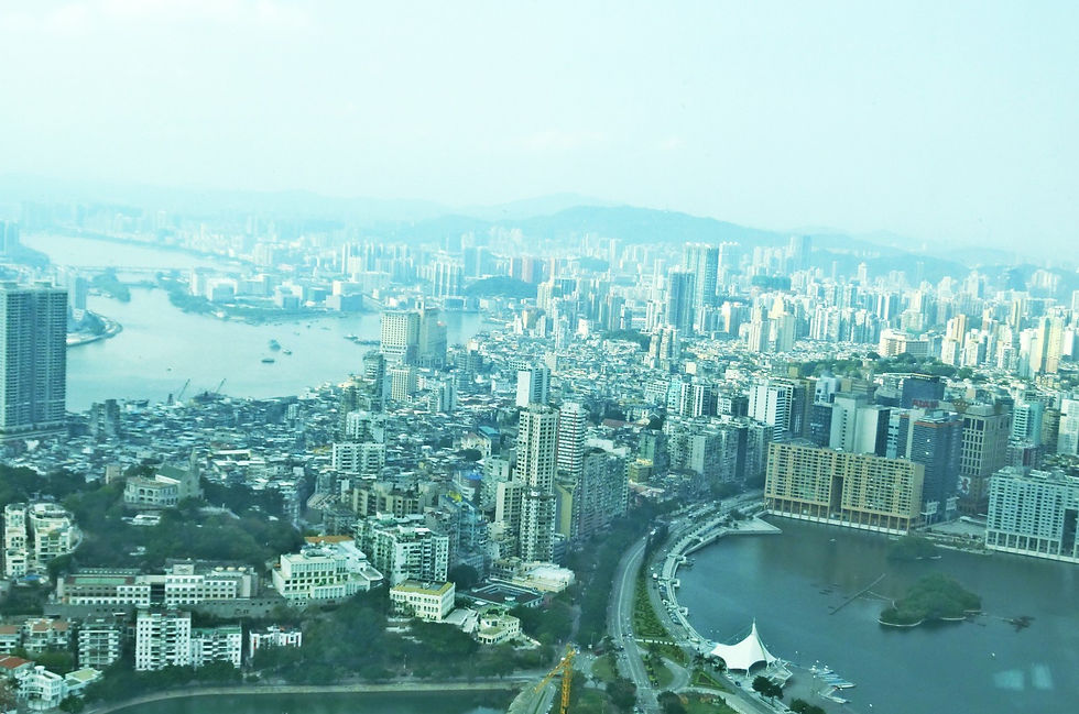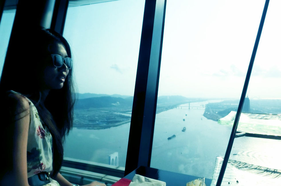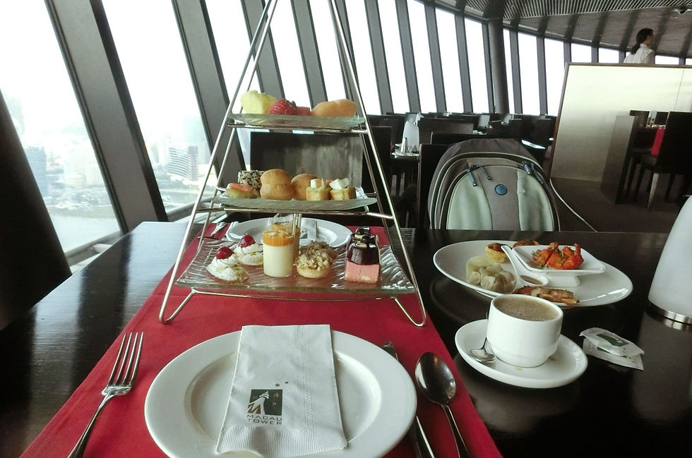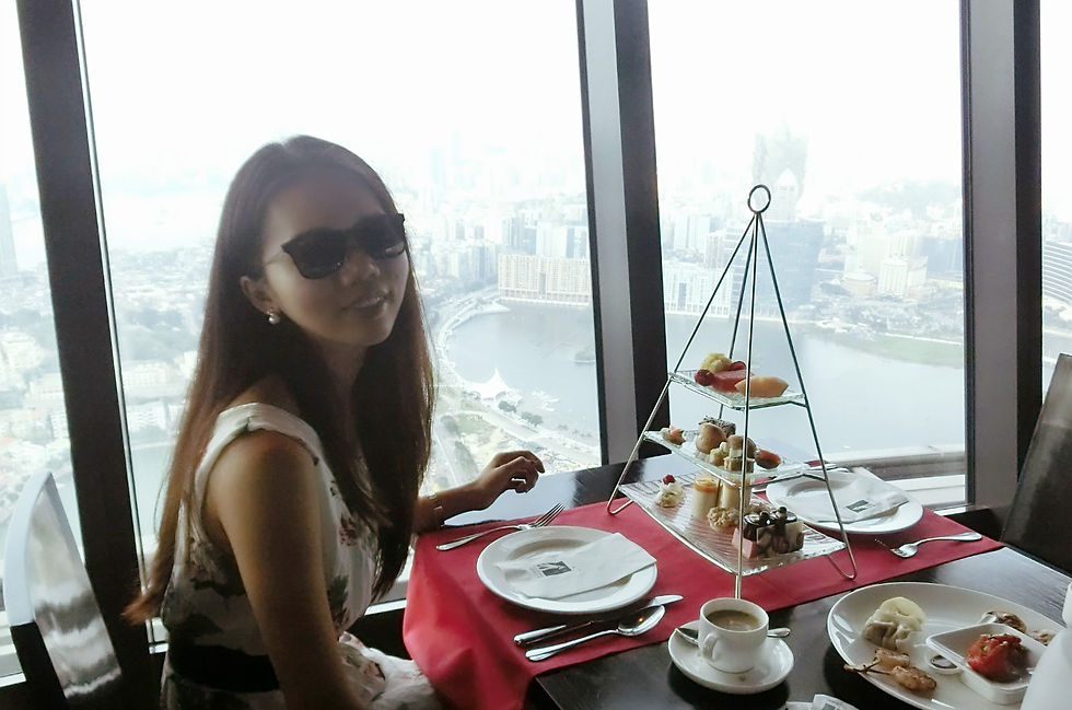 在澳门的天空与美景前,当然是要尽情享用美好的下午茶套餐,及我最喜欢的甜点食品。澳门「360°旋转餐厅」的设计是以环状空间概念,中间部分它是不会转,而会转的是在靠玻璃窗的座位区域。图(4)甜点照就能看到靠玻璃窗的位置。餐厅会在每一个半小时旋转一圈,随着餐厅旋转可饱览澳门美不胜收的醉人景色。如果在傍晚时用餐,会看到澳门城市的霓虹灯与日落互相辉映,会觉得非常浪漫的体验。